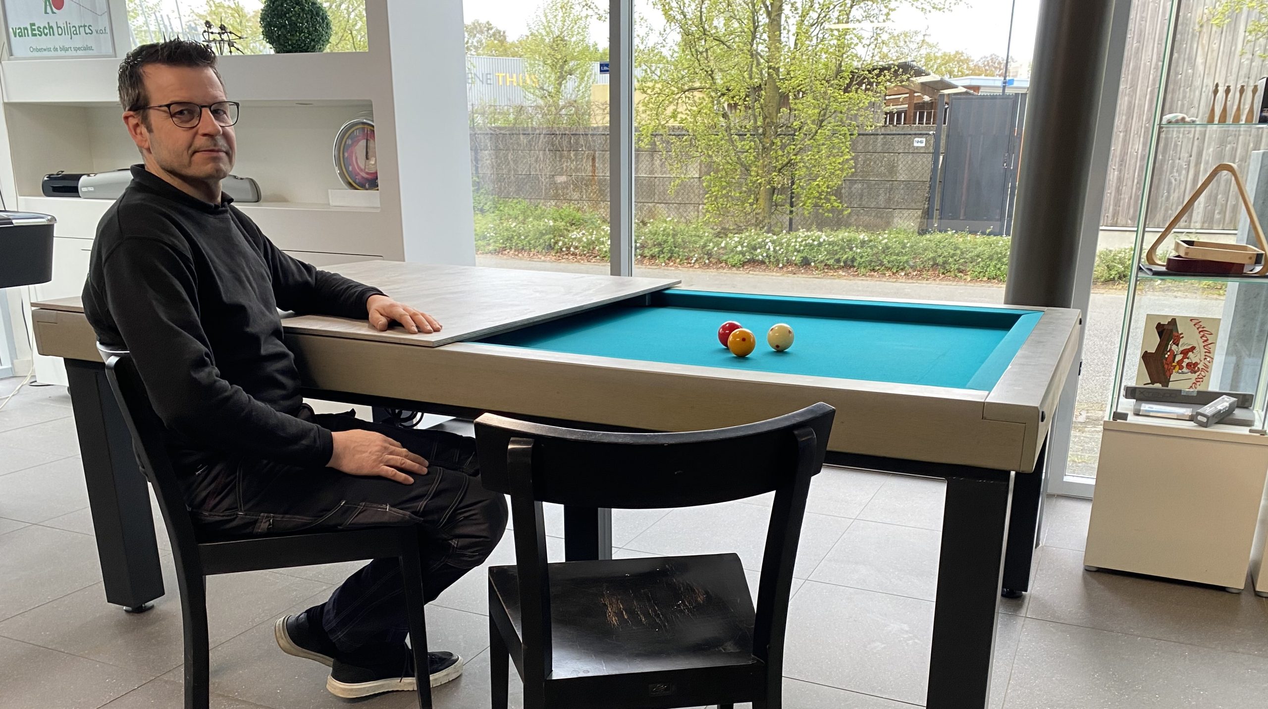 Erwin (52), die ook veel pooltafels en opgeknapte tweedehands biljarts verkoopt, staat er niet alleen voor. “Mijn vrouw Nicole werkt ook mee, in deeltijd. Ze heeft haar eigen baan, als assistent-accountant.” Drie keer raden welke tak van sport Nicole binnen Van Esch Biljarts vervuld. Daarnaast doet ze ook de inkoop, verkoop en de showroom. Ook de kinderen werken al mee in de onderneming. Zo kun je op zaterdag door dochter Tess (15 jaar) geholpen worden. Destijds hadden Ties en Mariet van Esch al goede connecties met Verhoeven Biljarts. “Dat is gebleven, want ze leveren kwaliteit. Ik houd me bezig met de oefentafels en speciale modellen. Dat zijn biljarts met een afwijkende maat, één bij twee meter bijvoorbeeld. En biljarts waar je stoelen onder kunt zetten, dus multifunctioneel zijn. Een partij op spelen, een plaat erop. Dan kun je dat biljart gebruiken als eettafel.”